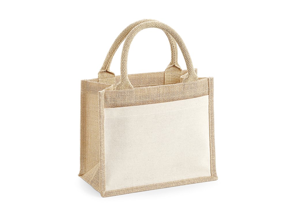 Taška je vyrobena ze 100% laminované juty. Přední kapsa je z bavlny.